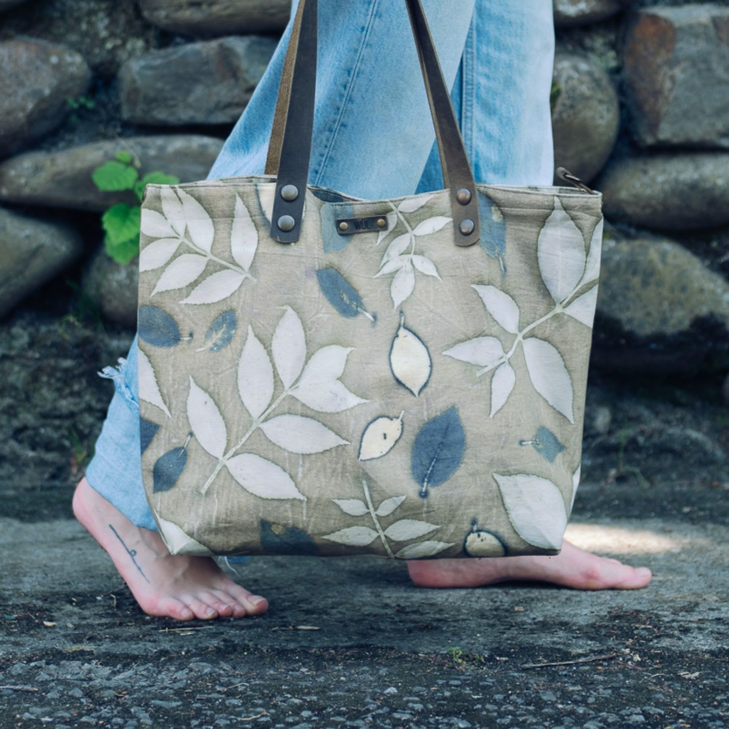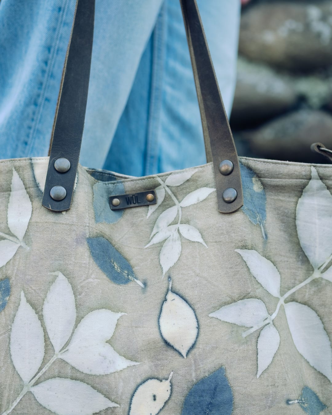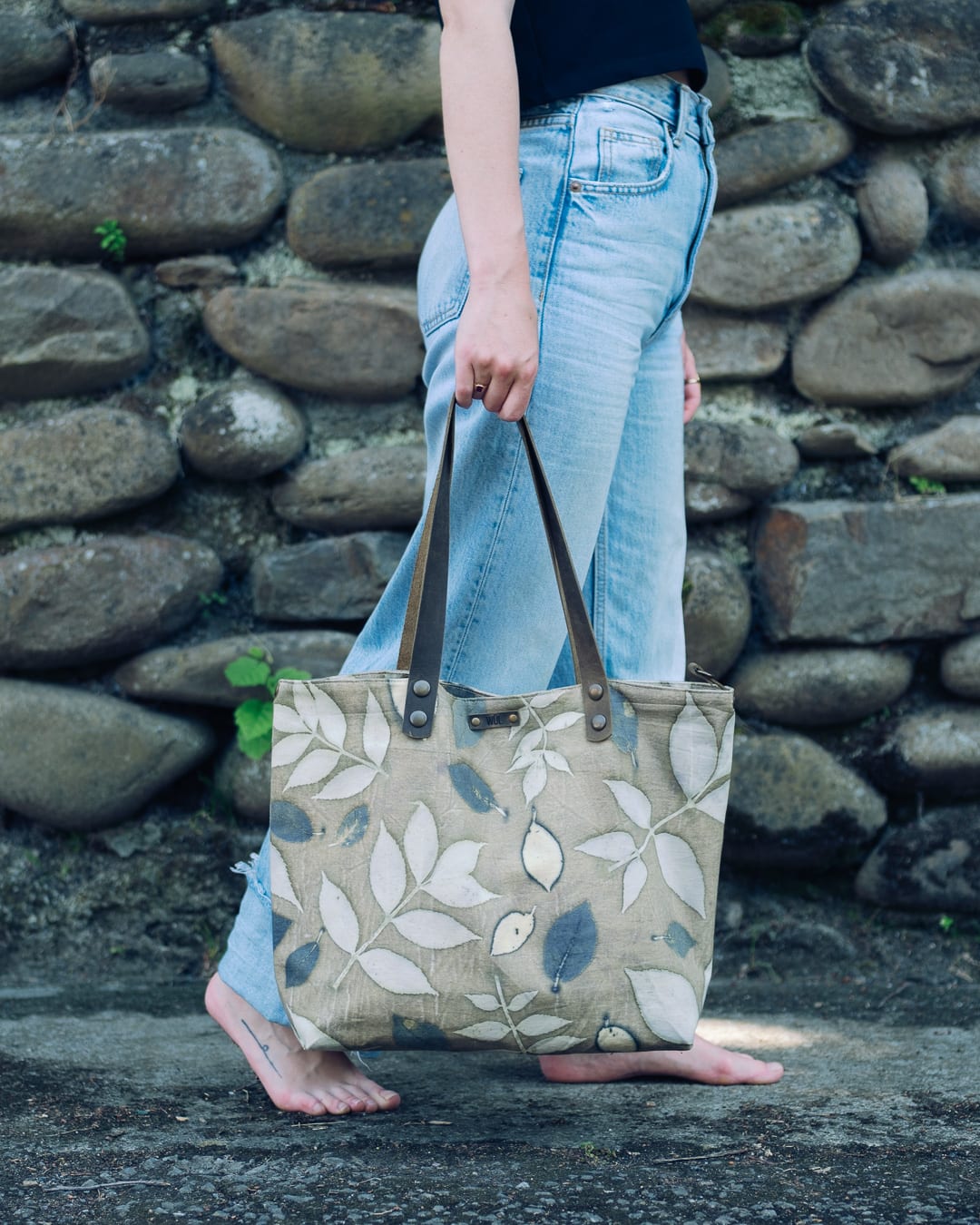 Confeccionado a mano en canvas de algodón orgánico con certificado GOTS y PETA VEGAN, y estampado con hojas frescas de Prunus cerasífera y Fresno. El fondo de color verde ha sido creado con tinte natural de piel de granada.