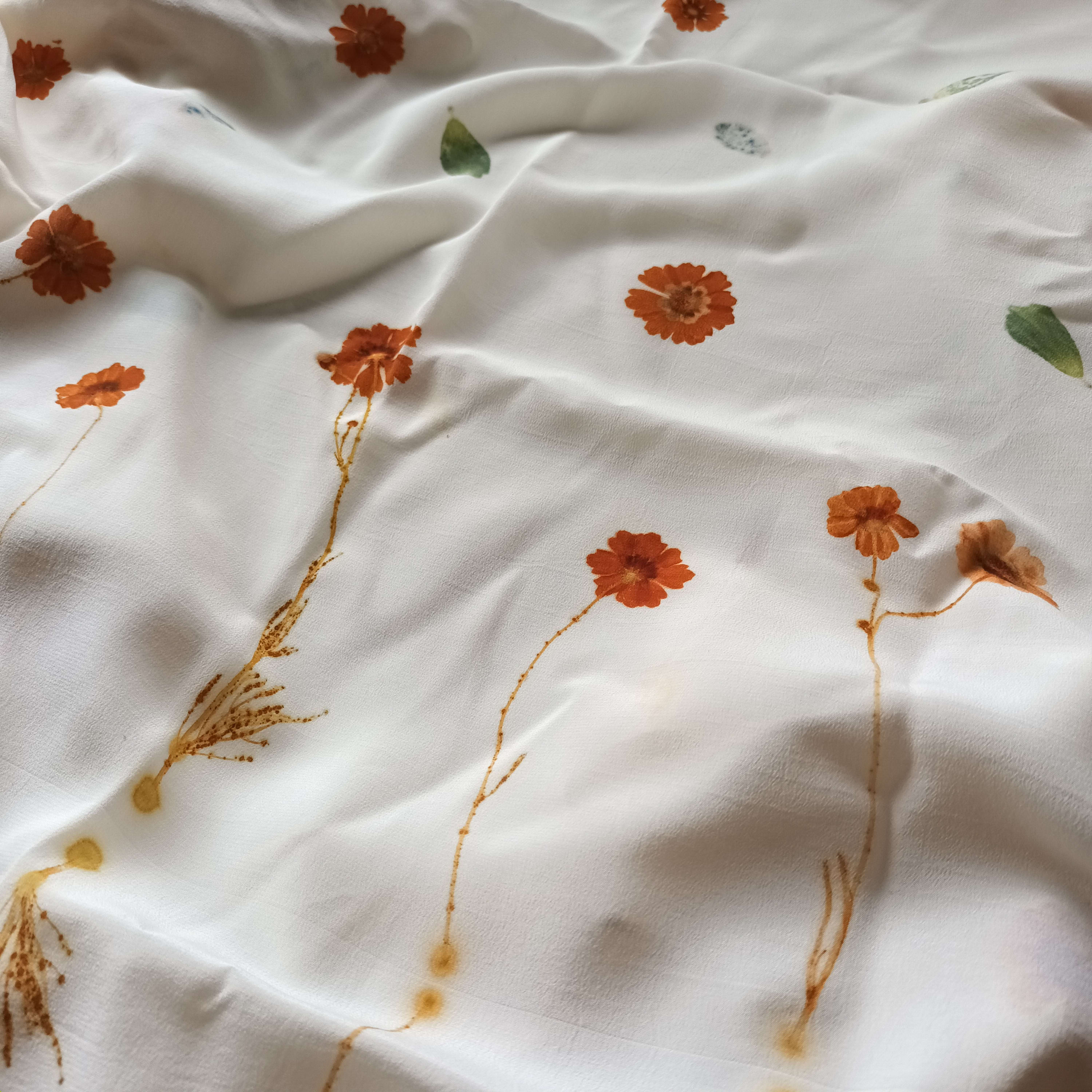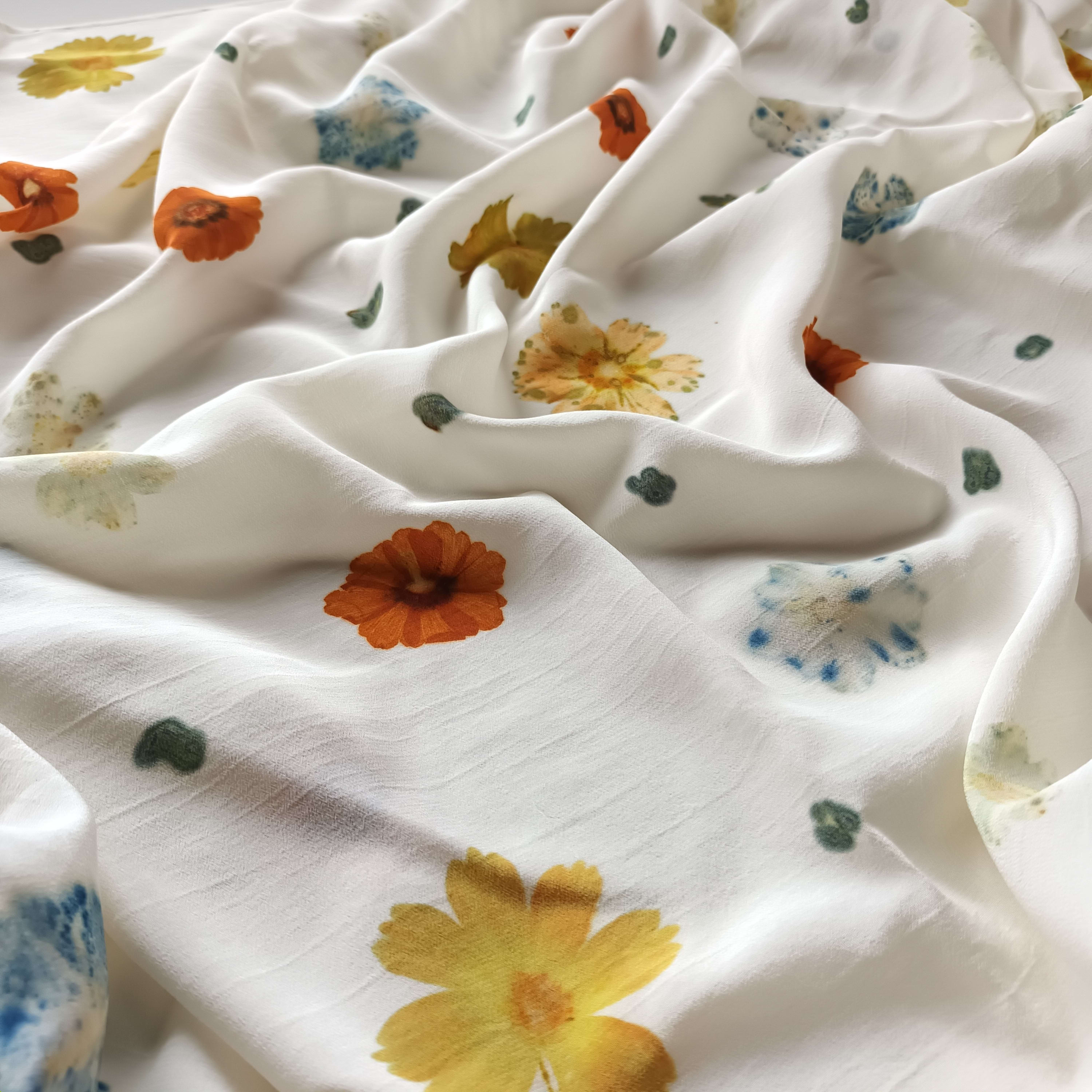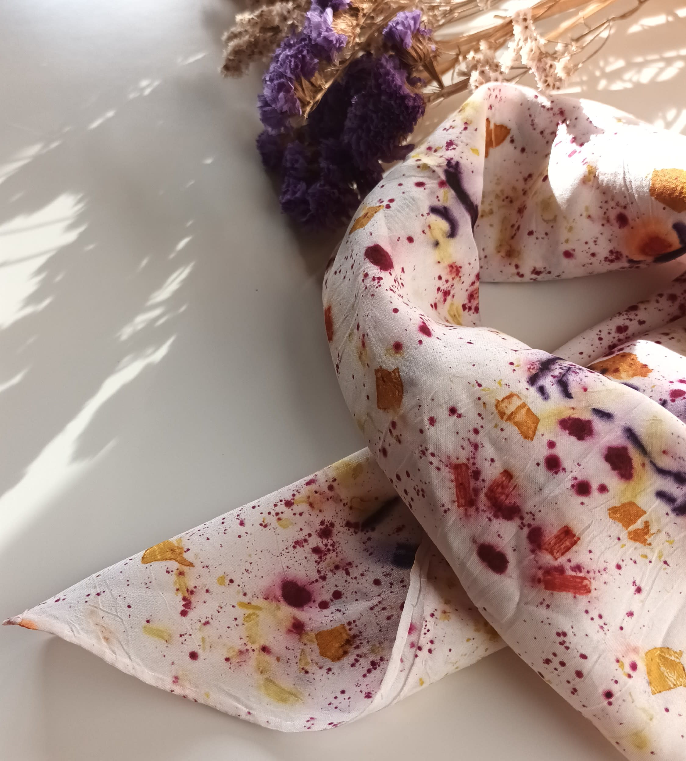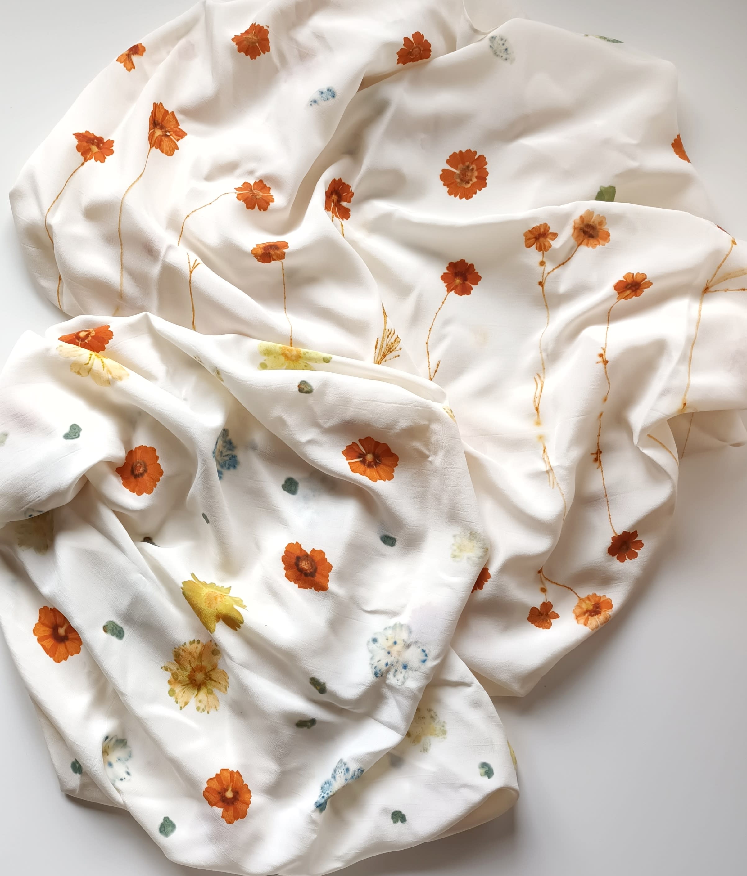 En este workshop aprenderás la técnica de Ecoprint desde cero y paso a paso para transferir los pigmentos y las formas de hojas y flores a un pañuelo de seda natural (70×70 cm).