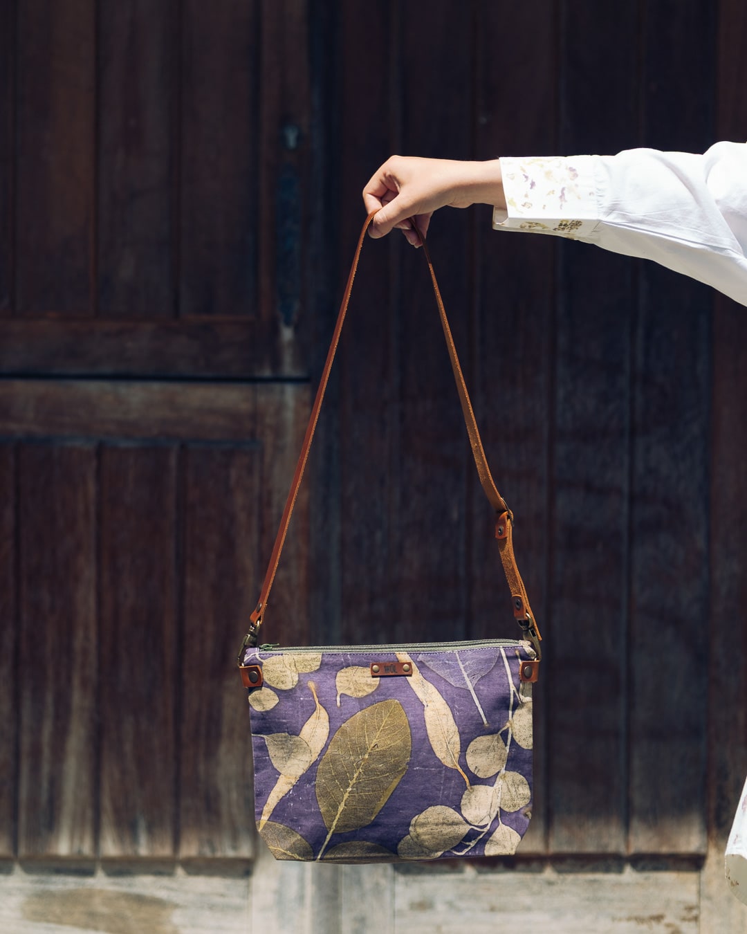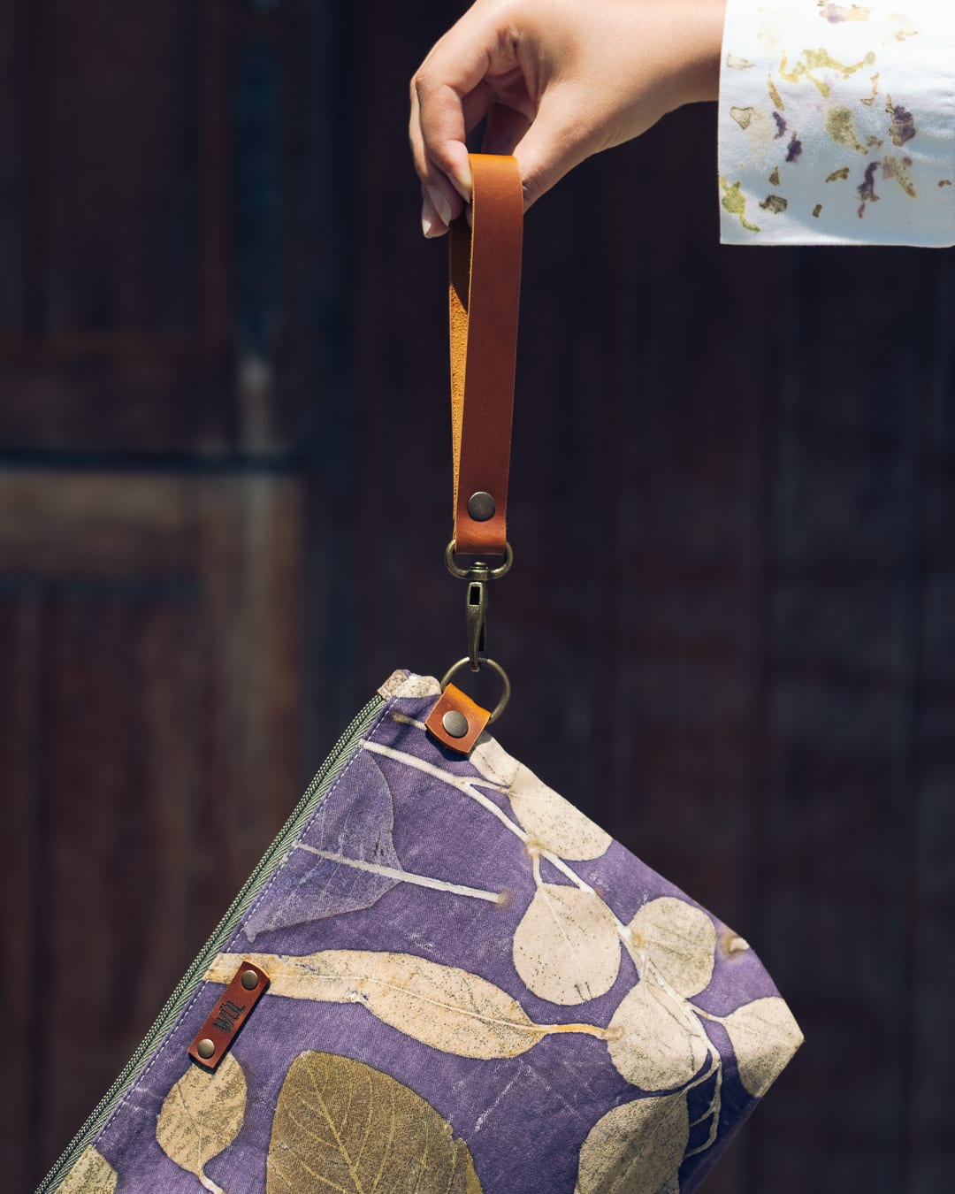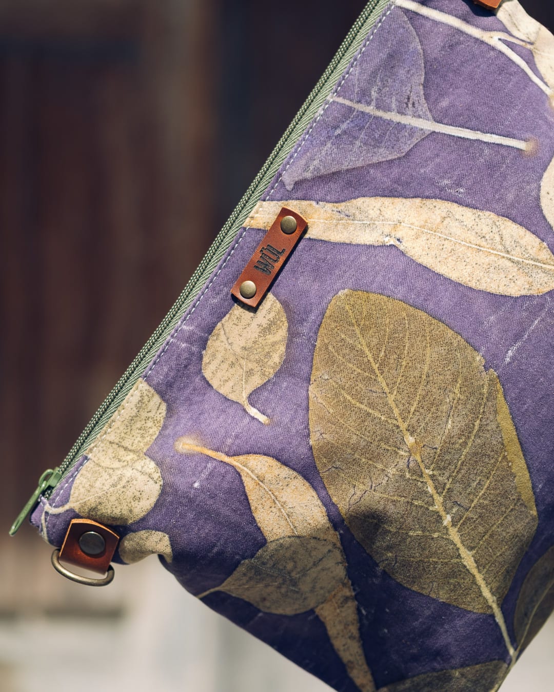 Confeccionado a mano en sarga gruesa de algodón orgánico con certificado GOTS y PETA VEGAN, y estampado con una cuidada selección de hojas frescas naturales. Interior en algodón orgánico OCS100 color natural con un bolsillo de dos compartimentos.