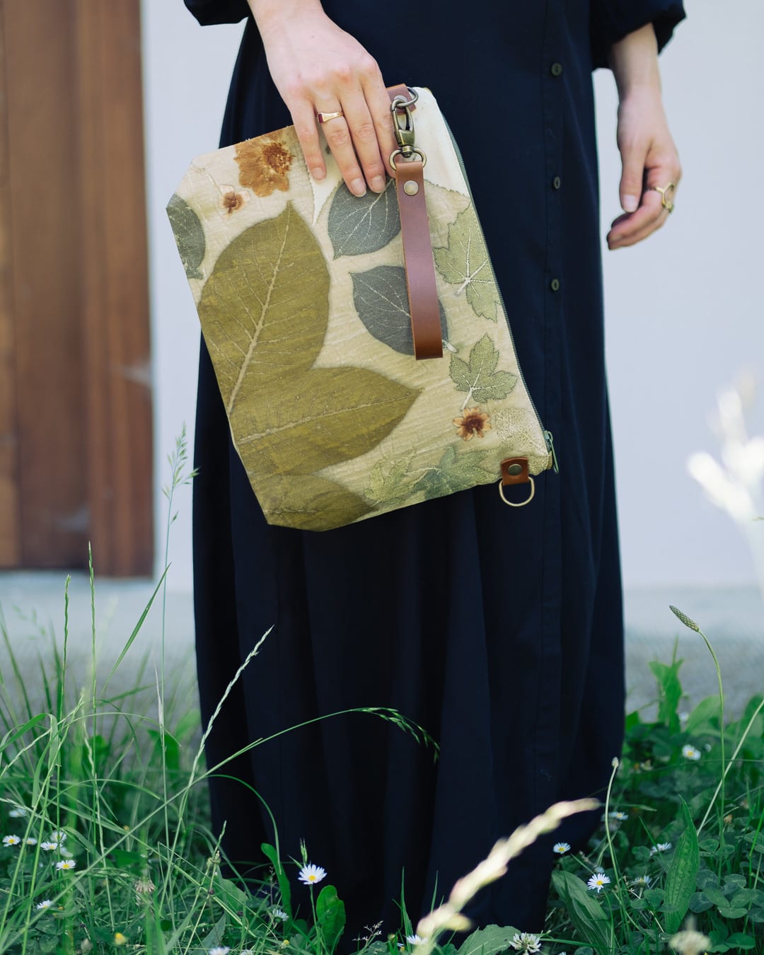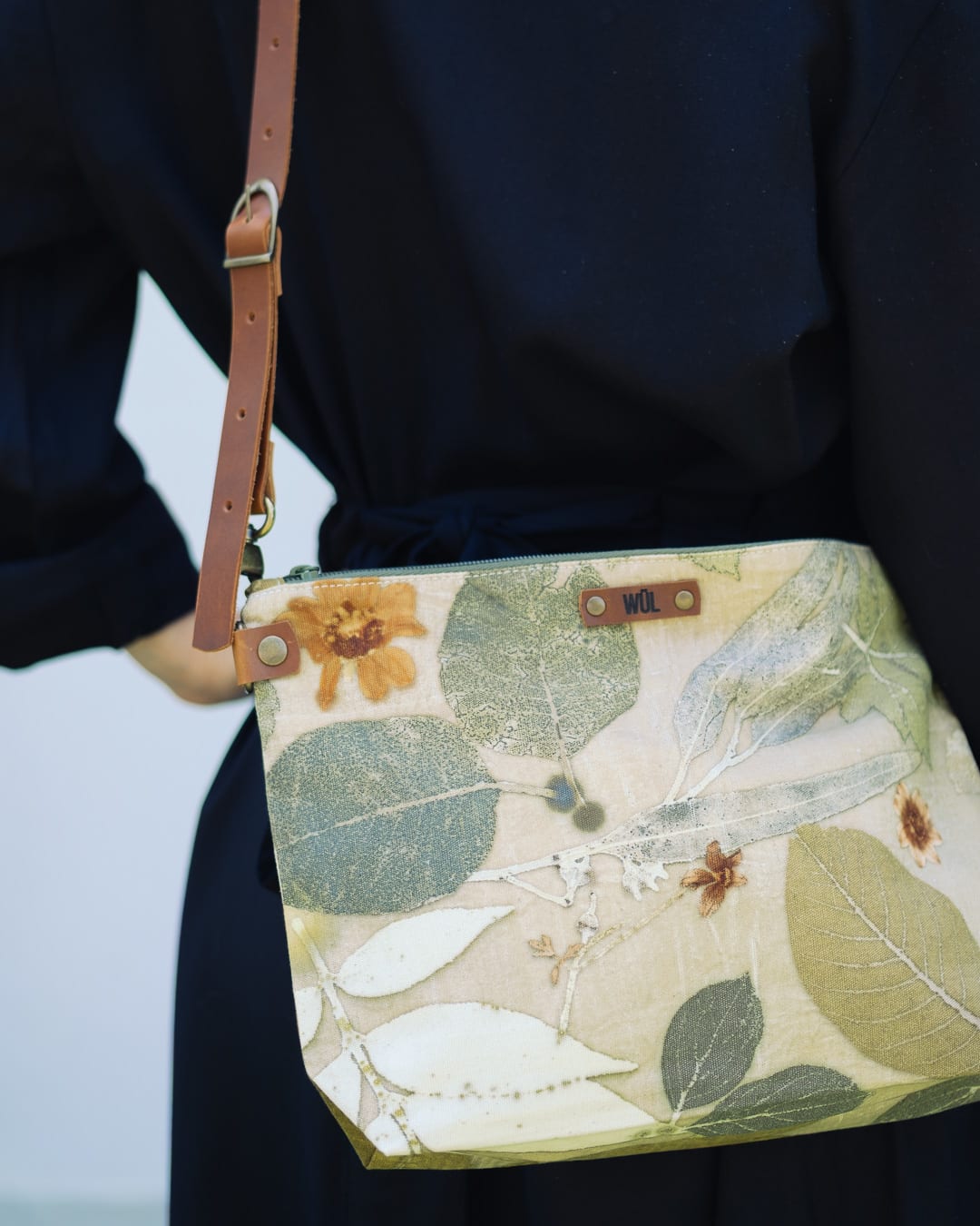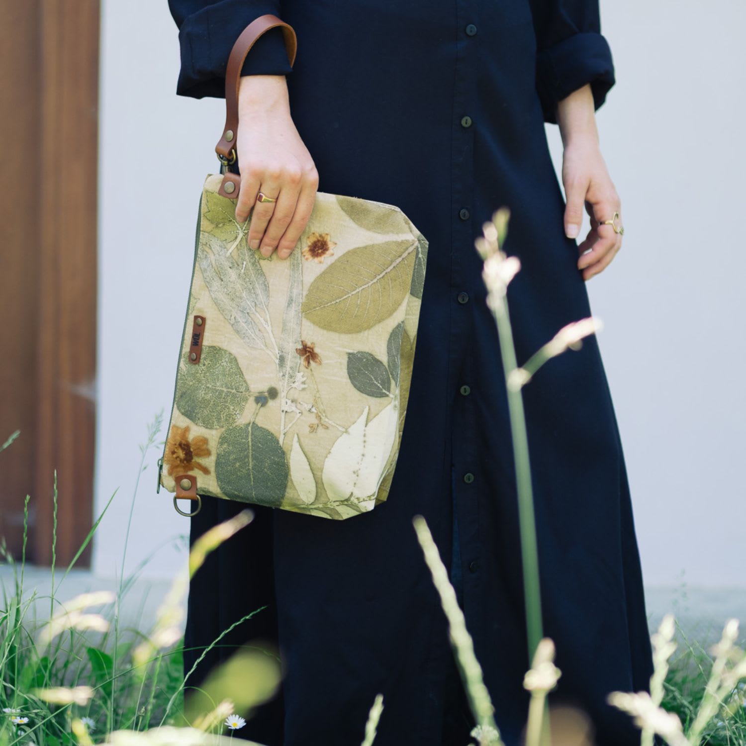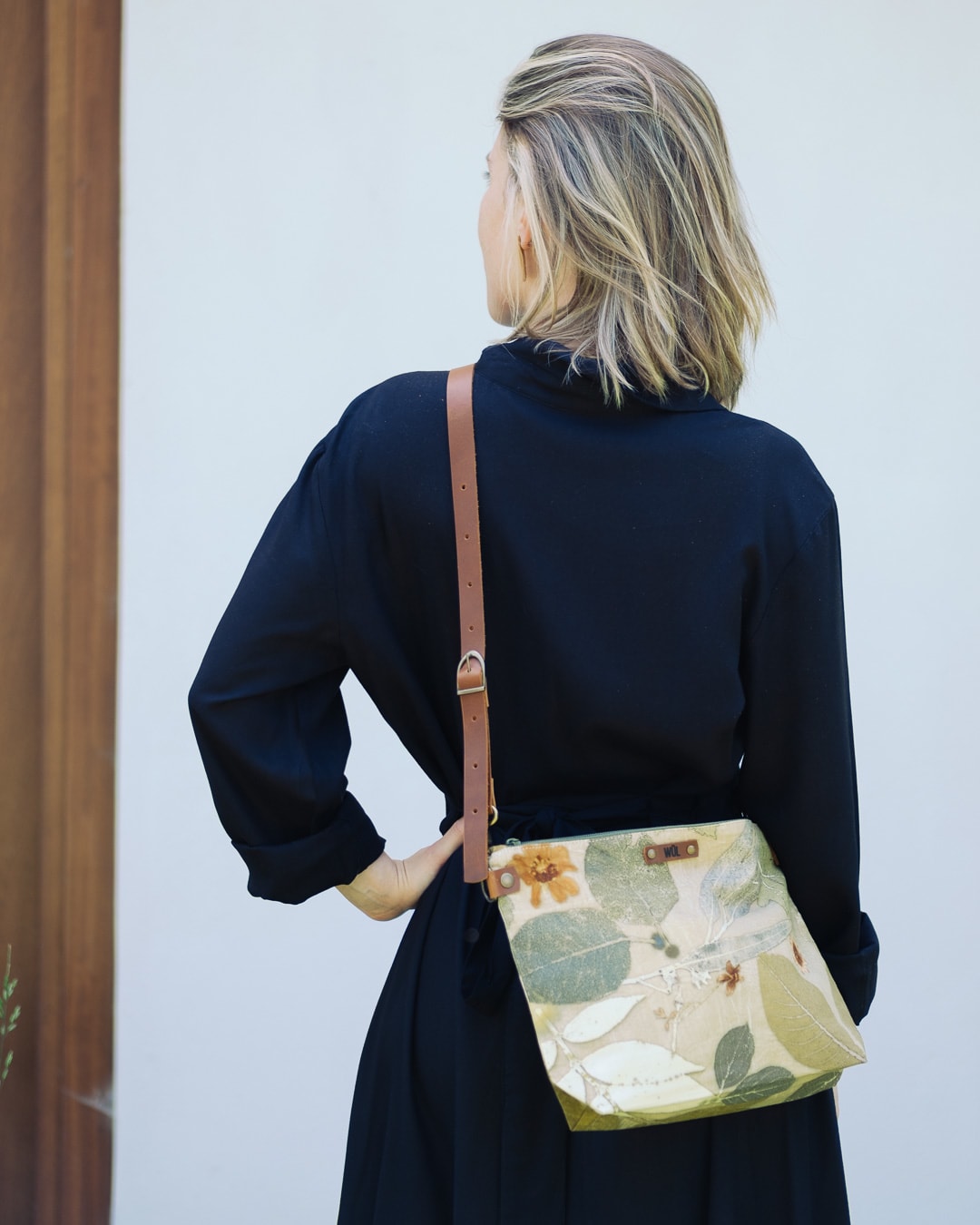 Confeccionado a mano en canvas de algodón orgánico con certificado GOTS y PETA VEGAN, y estampado con una cuidada selección de hojas frescas y flores naturales cultivadas en mi jardín tintóreo. Interior en algodón orgánico OCS100 color natural con un bolsillo de dos compartimentos.