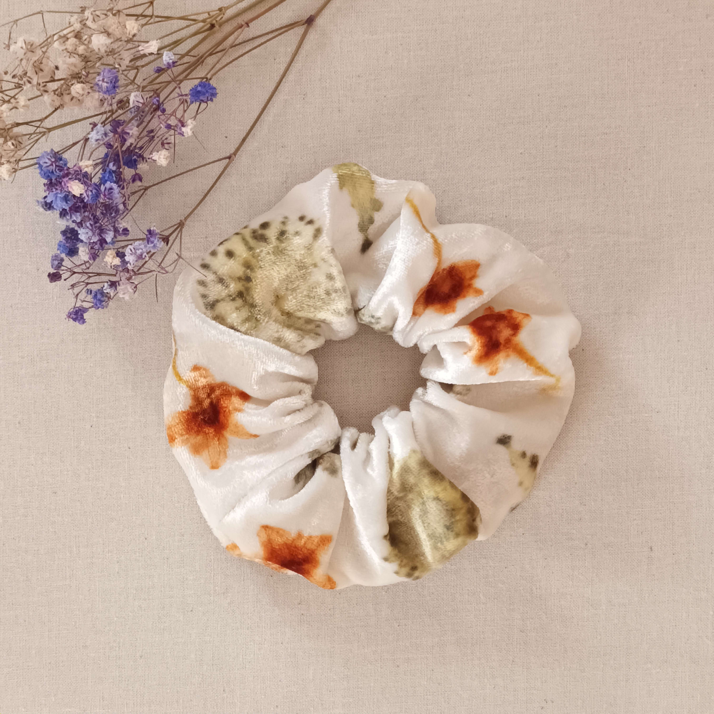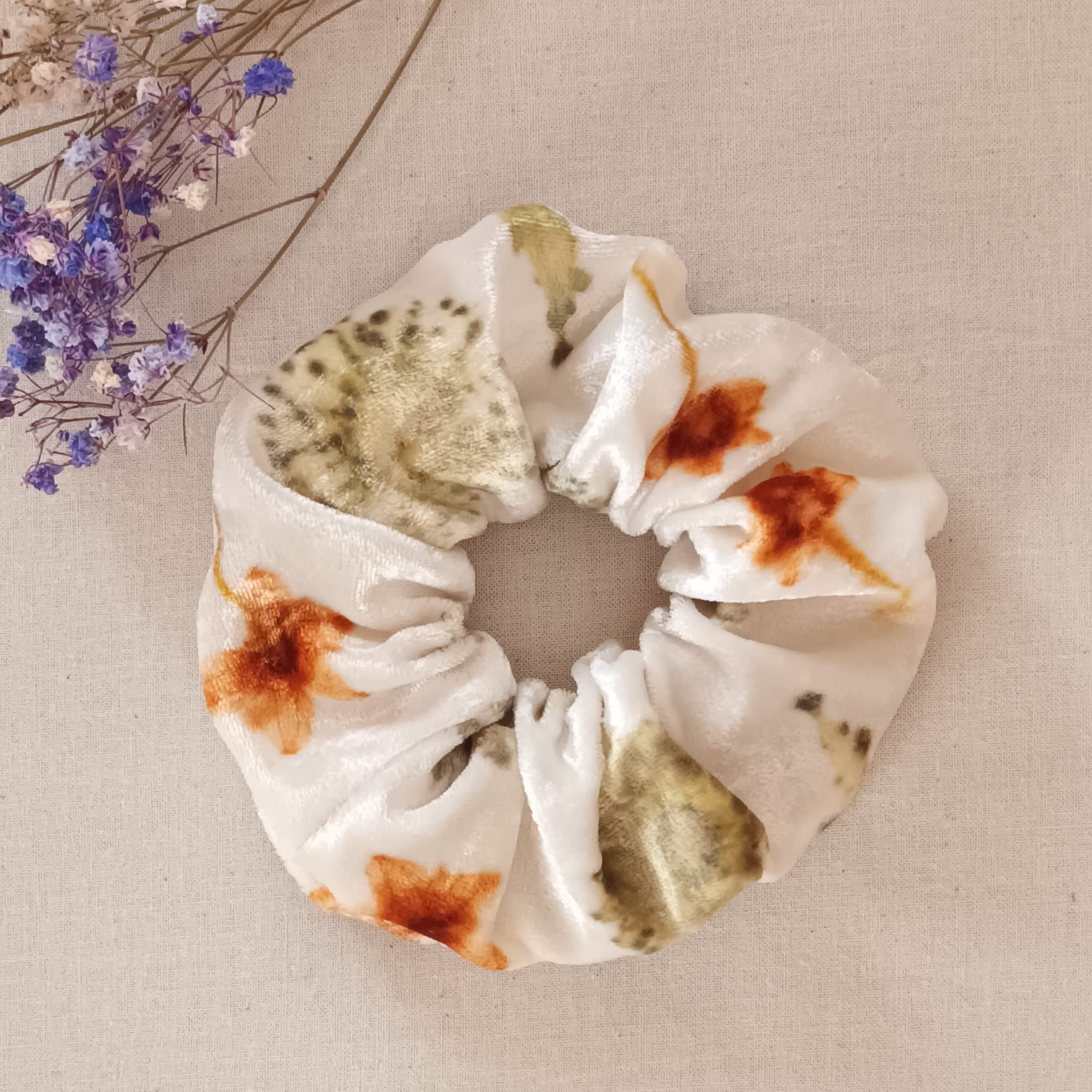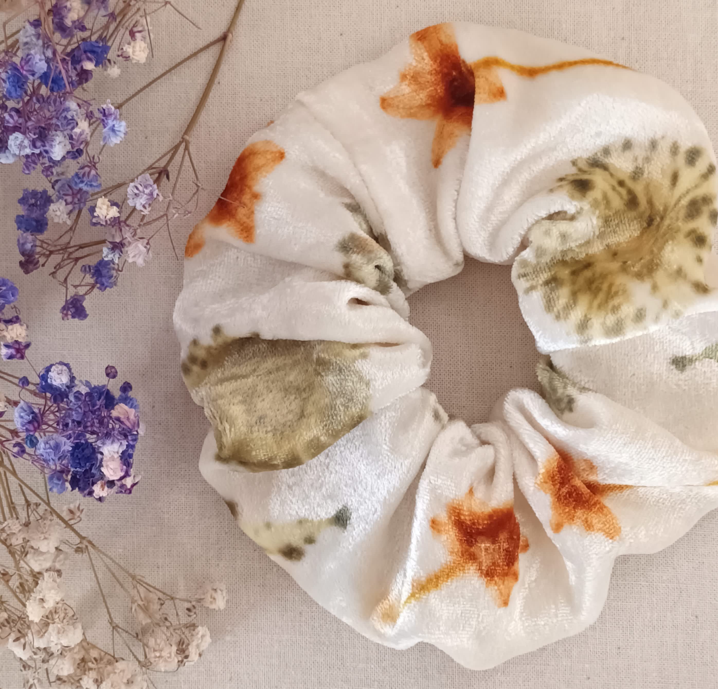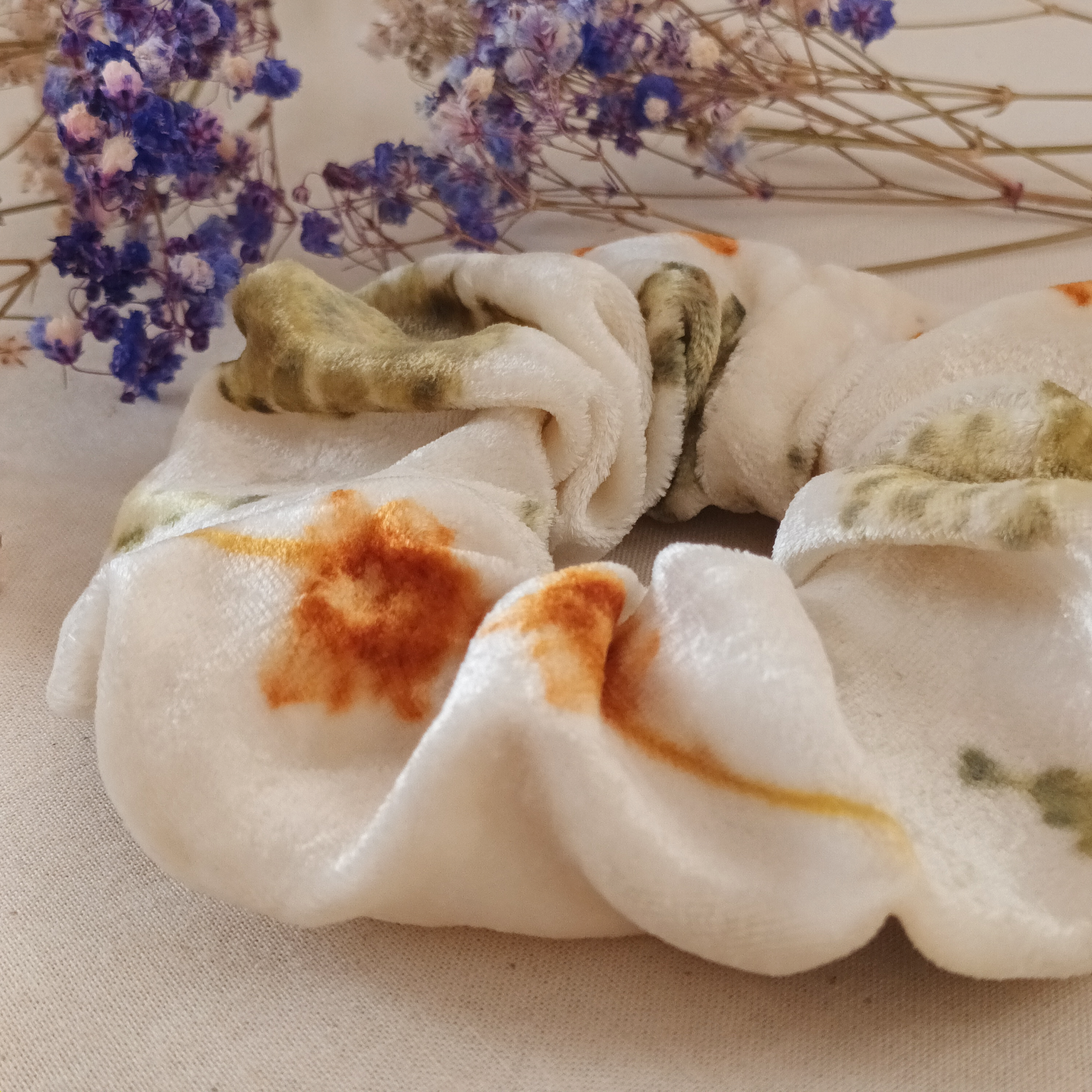 Scrunchie XL confeccionado en terciopelo de seda natural y estampado con flores naturales de bidens ferulifolia de cultivo ecológico.