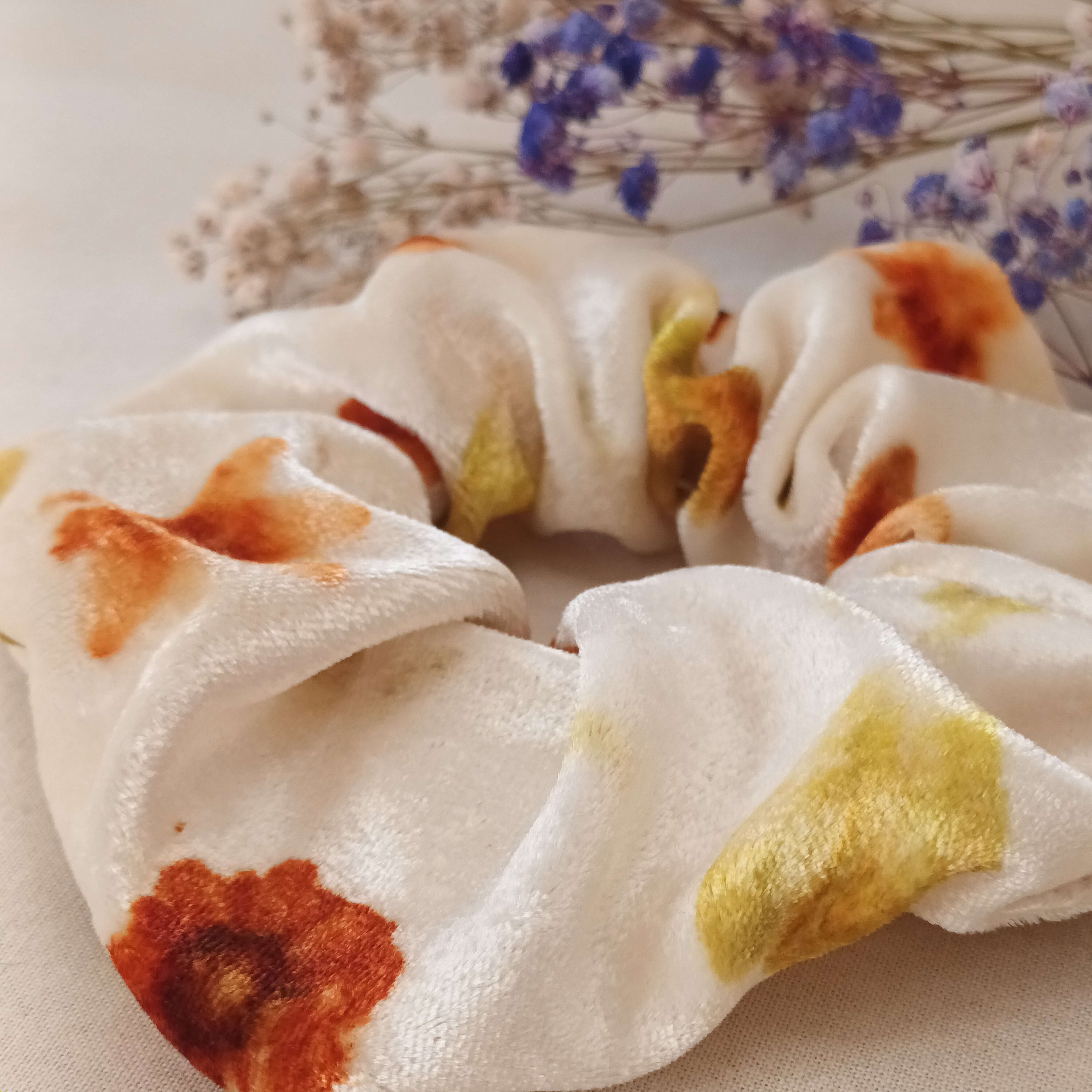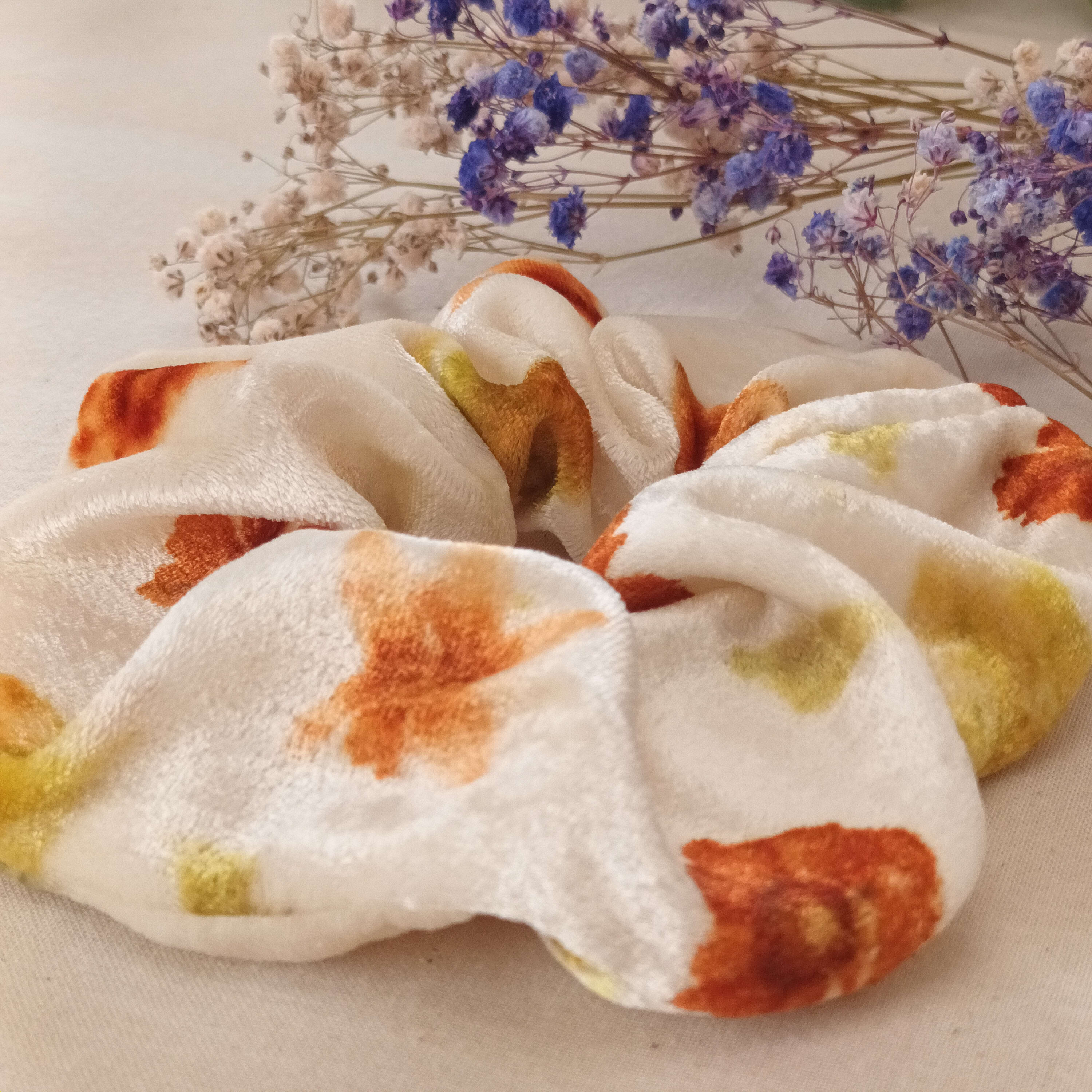 Scrunchie XL confeccionado en terciopelo de seda natural y estampado con flores naturales de coreopsis, bidens y pétalos de cosmos apricot – de cultivo ecológico-.