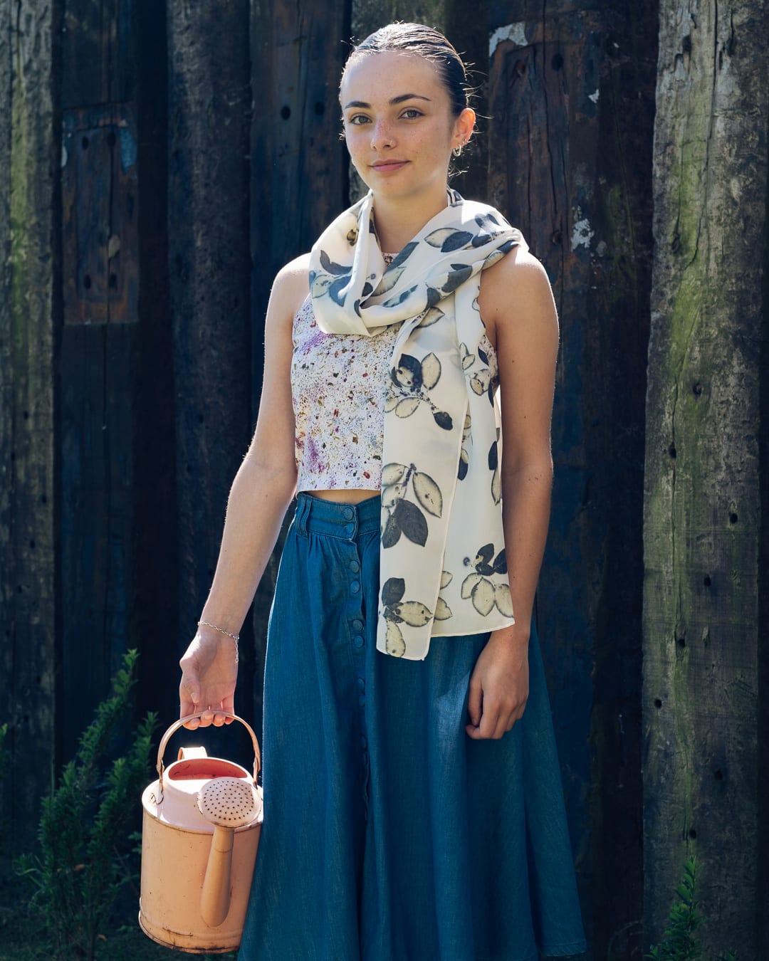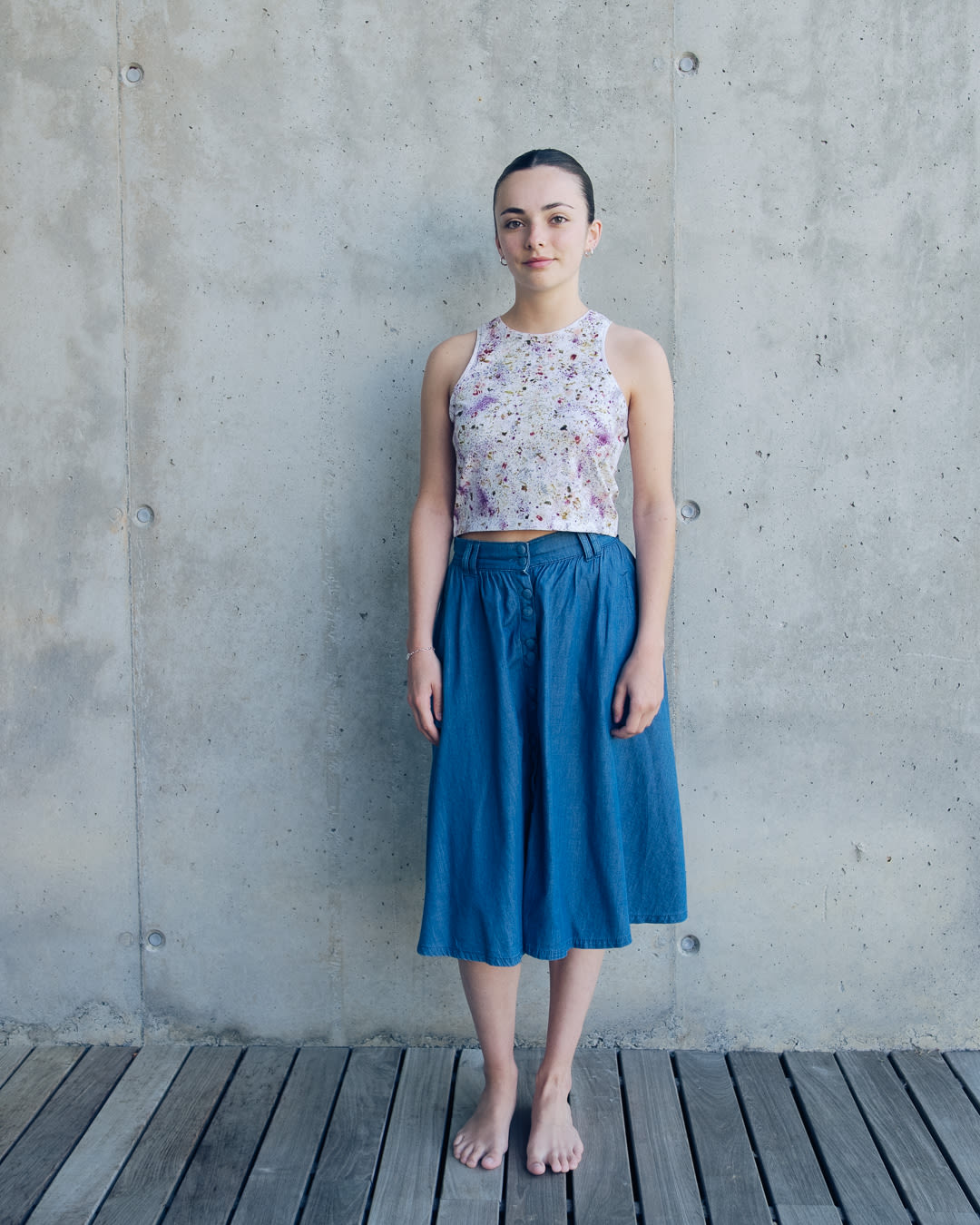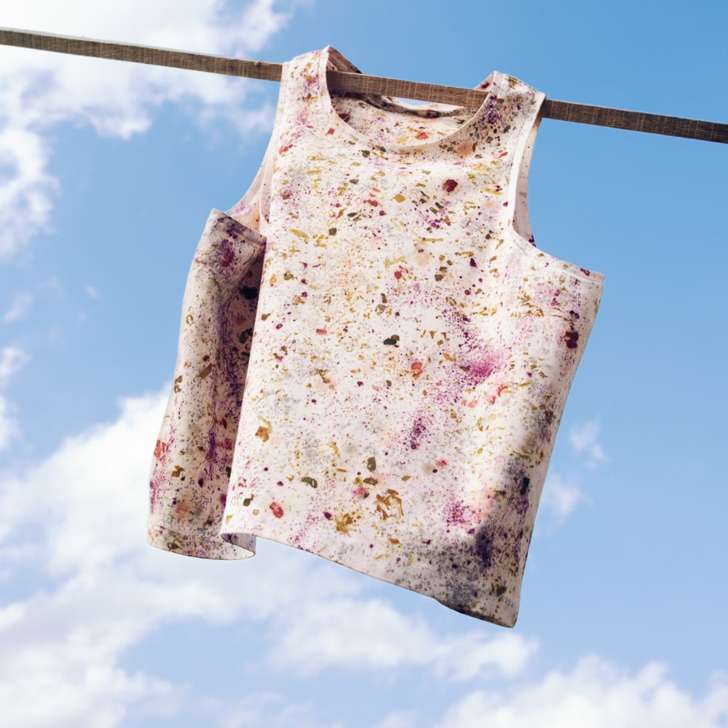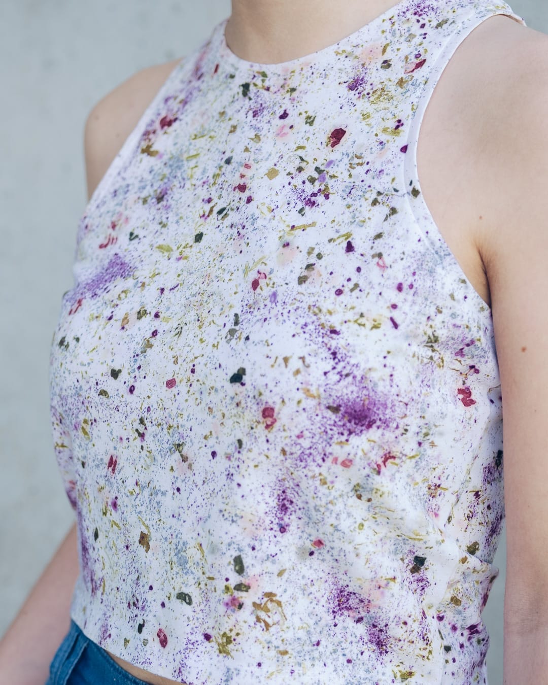 Top de tirantes confeccionado en algodón orgánico certificado y estampado a mano con materias tintóreas trituradas que generan un patrón abstracto lleno de color (cochinilla canaria, reseda luteola, raíz de rubia tinctória, zumaque y piel de cebolla rubia y morada).